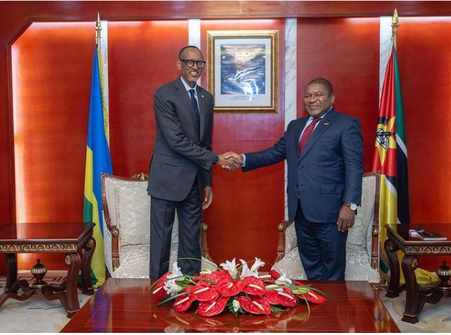 President Paul Kagame is in Mozambique for a 1-day working visit. On arrival in Maputo on Friday, he was welcomed by President Filipe Jacinto Nyusi at the Office of the President for a tête-à-tête discussion followed by a bilateral meeting to deepen further ties between the two countries.