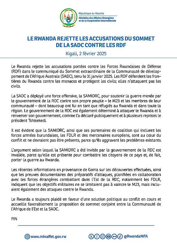 Kigali, 2 février 2025 - Le Rwanda rejette les accusations portées contre les Forces Rwandaises de Défense (RDF) dans le communiqué du Sommet…